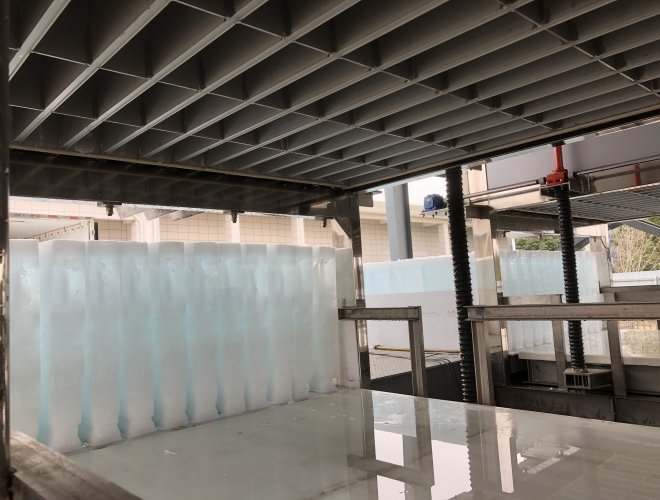 ●自動化程度高,自動上水、自動制冰、自動脫冰。脫冰后可直接推送裝車,也可將冰塊推送到輸送帶上,自動輸送到冰庫,自動碼垛。